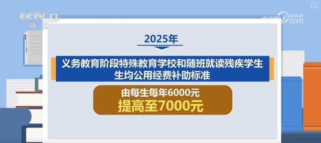 2025年8月,财政部提出进一步加大对特殊教育学校支持保障力度。继续安排特殊教育补助资金5亿元,支持地方持续改善特殊教育学校办学条件。2025年,义务教育阶段特殊教育学校和随班就读残疾学生生均公用经费补助标准由每生每年6000元提高至7000元,惠及约91万残疾学生。